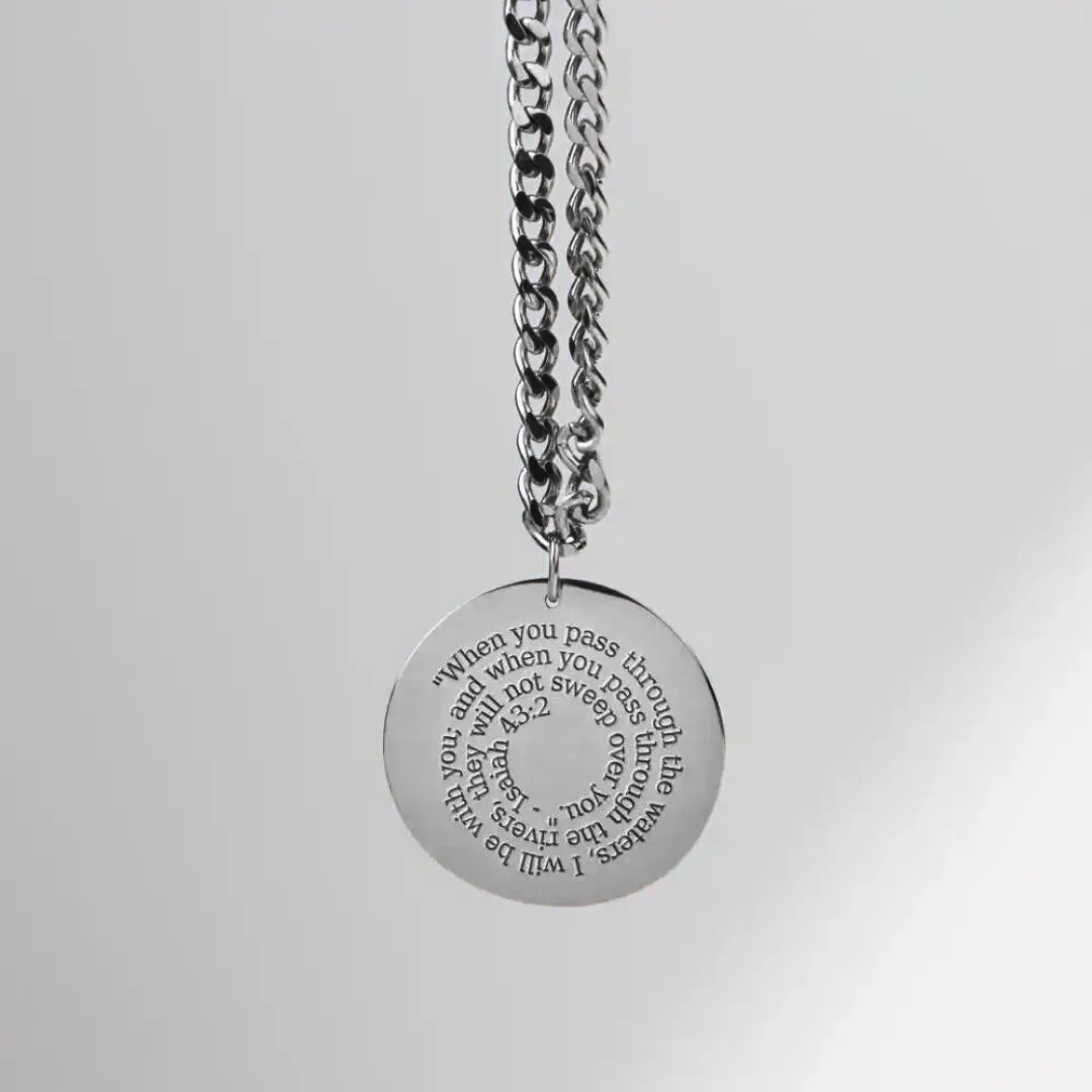 Our Christian Personalized Initial ‘W’ Pendant is a beautifully crafted piece, perfect for anyone whose name starts with ‘W’. The front of the pendant features a stunningly engraved initial ‘W’, showcasing elegance and faith. The back of the pendant includes a pre-engraved inspirational quote from Isaiah 43:2: “When you pass through the waters, I will be with you; and when you pass through the rivers, they will not sweep over you.” Additionally, you have the option to customize the back with your own message. Choose between spiral engraving, where the text spirals outward, or inline engraving, with text arranged in straight lines. This makes it a perfect, personalized gift for any occasion, and a pendant gift for people who’s name begins with W.