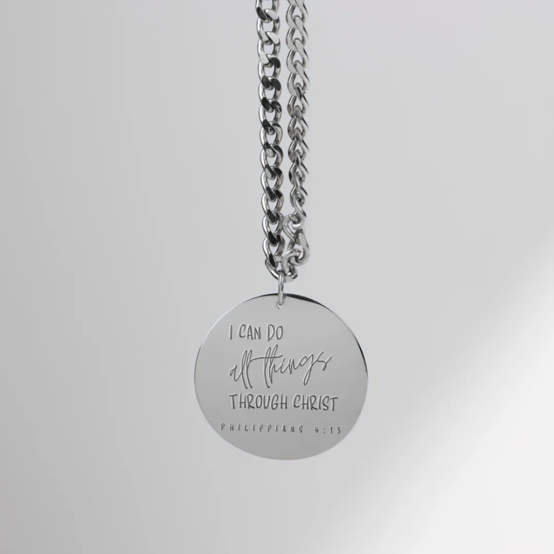 Introducing the “I Can Do All Things Through Christ” Pendant, an inspiring piece of faith-based jewelry. The front displays the empowering message “I Can Do All Things Through Christ” from Philippians 4:13, symbolizing strength and perseverance through faith. This elegant pendant comes with a durable and stylish chain, making it a perfect gift for any occasion.