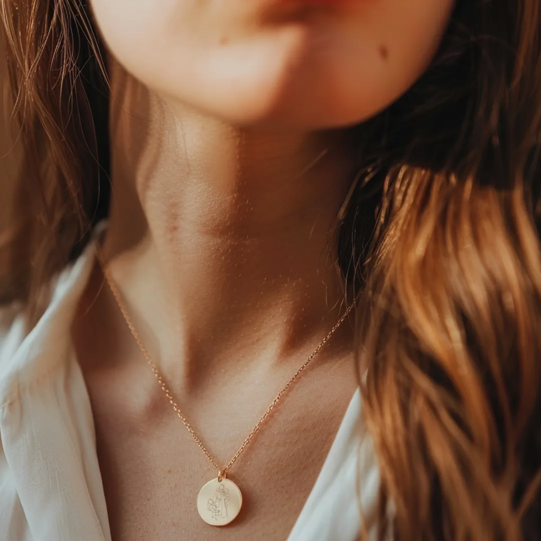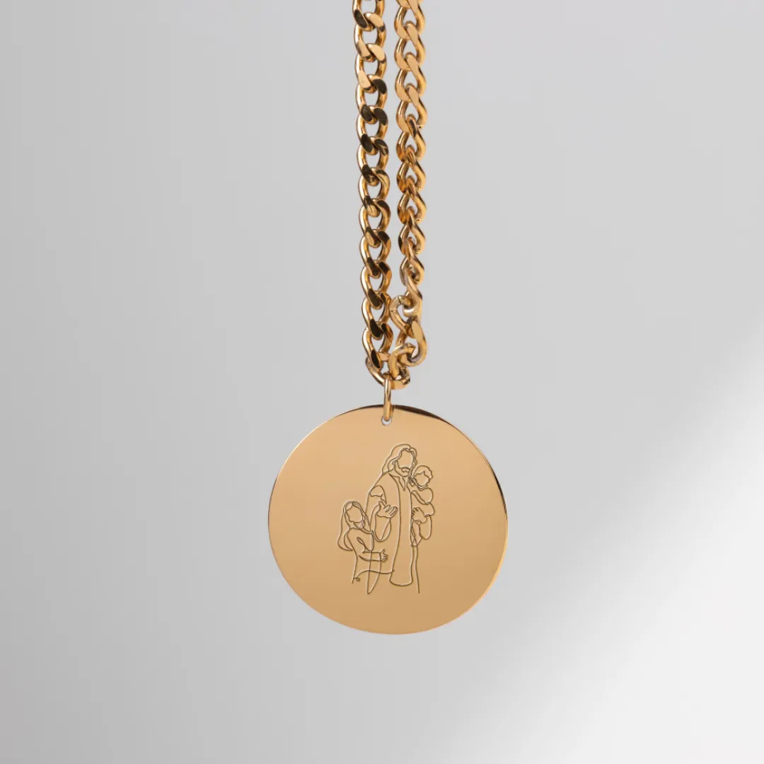 Introducing the Jesus with Children Pendant, a heartwarming piece of faith-inspired jewelry. This elegant pendant features a delicate line art engraving of Jesus with children on the front, symbolizing love, care, and faith. The pendant comes with a durable and stylish chain, making it a perfect gift for any occasion. For added personalization, the back can also be engraved with your choice of text, including a name, date, custom message, Bible verse, or song lyric, in either a unique spiral or traditional inline text. This piece is available in premium gold or silver plating, ensuring it stands out as a statement of faith and affection.