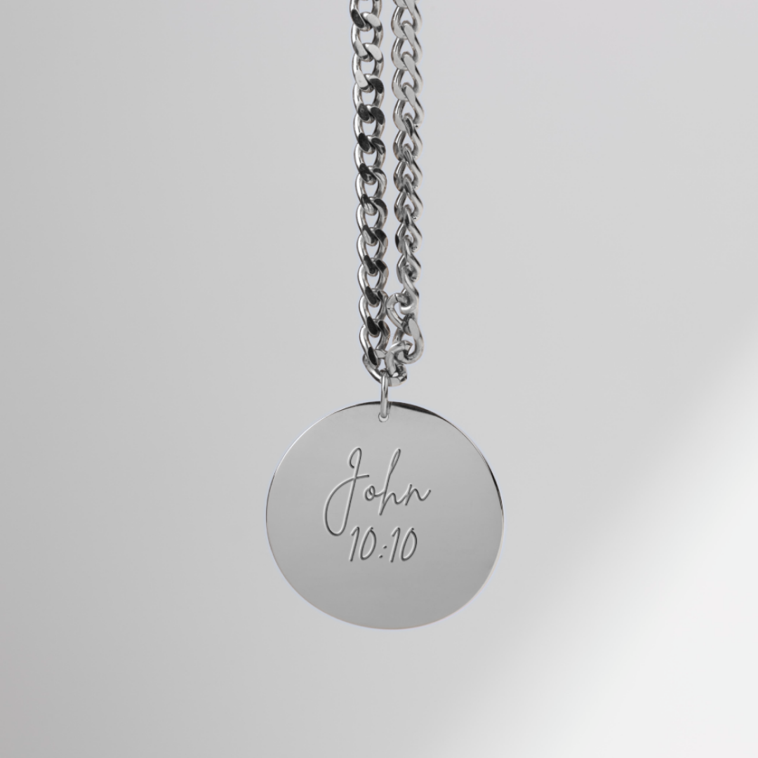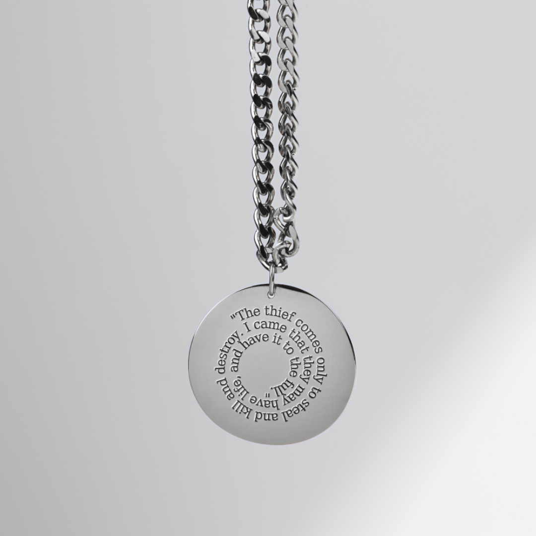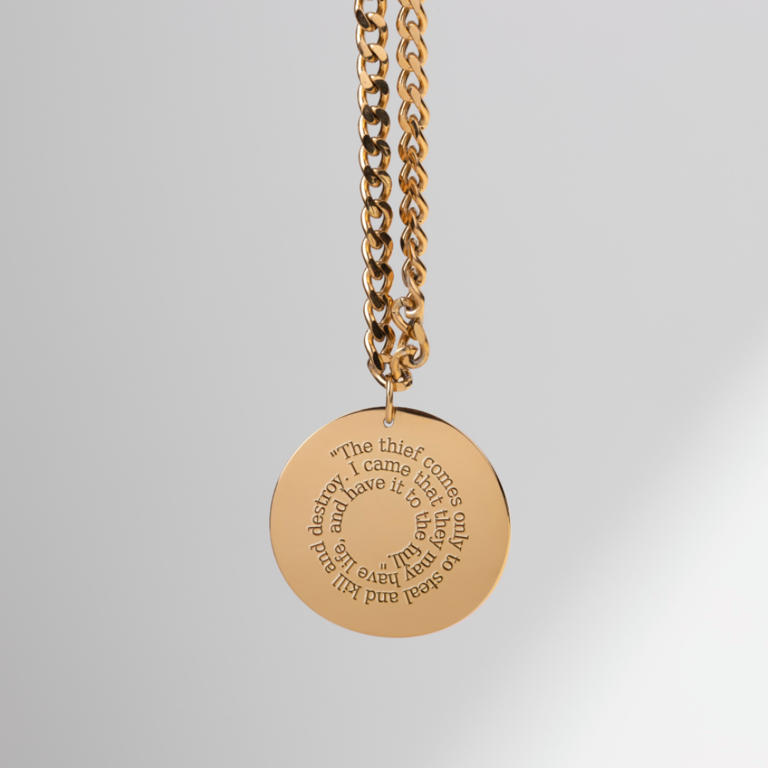 Introducing the John 10:10 Bible Verse Pendant, a beautifully crafted piece of Christian jewelry. The front of the pendant is engraved with the powerful verse from John 10:10: “The thief comes only to steal and kill and destroy; I came that they may have life and have it abundantly.” This verse serves as a daily reminder of the abundant life that Jesus promises to all who follow Him. The pendant is available in both gold and silver plating, offering a touch of elegance for any occasion. You can also personalize the back with a custom message, such as a name, date, or another Bible verse. This personalization option transforms the pendant into a unique and meaningful gift for any special occasion.