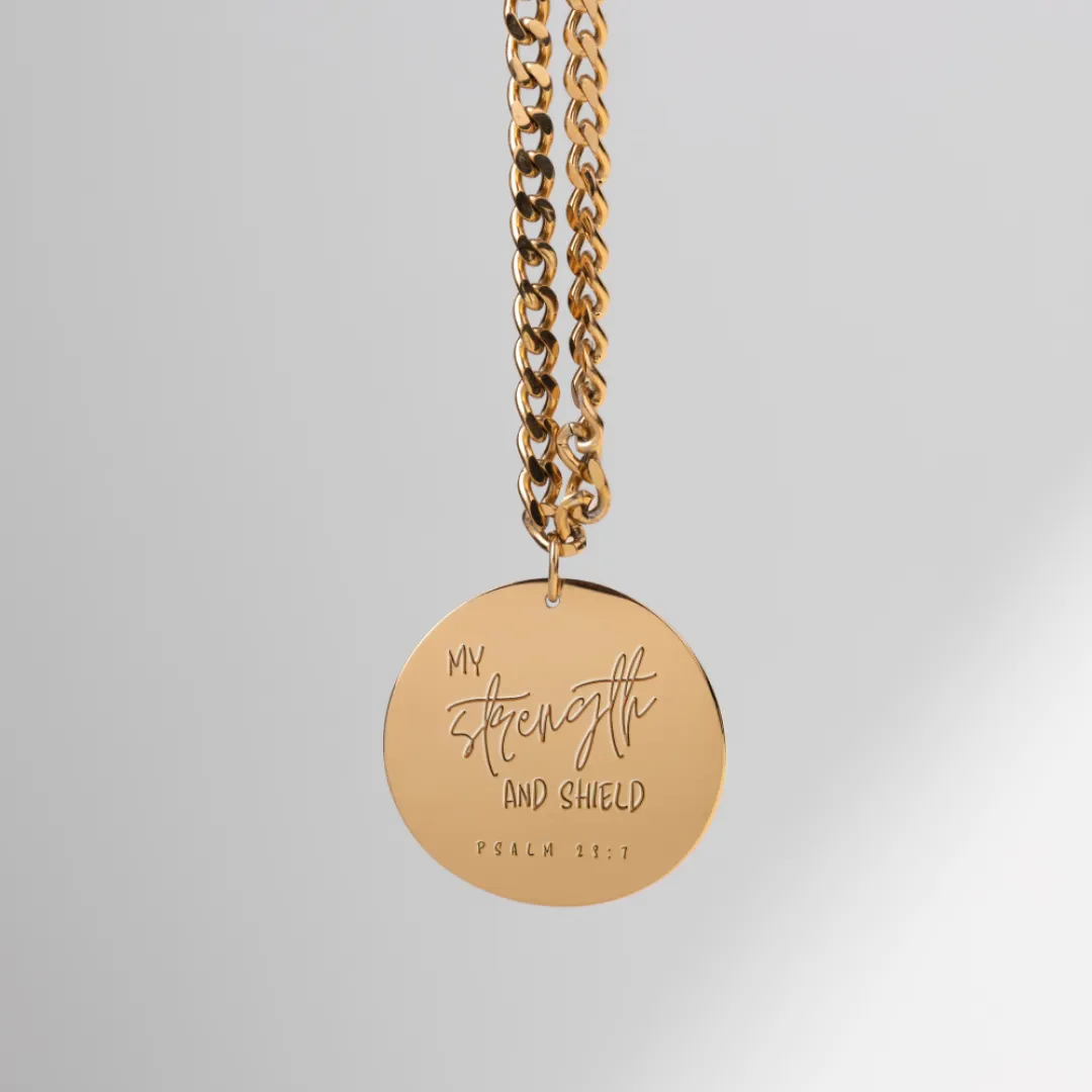 Introducing the “My Strength and Shield” Pendant, a beautiful piece of faith-inspired jewelry. The front displays the empowering message “My Strength and Shield” from Psalm 28:7, symbolizing the protection and strength found in faith. This elegant pendant comes with a durable and stylish chain, making it a perfect gift for any occasion.
